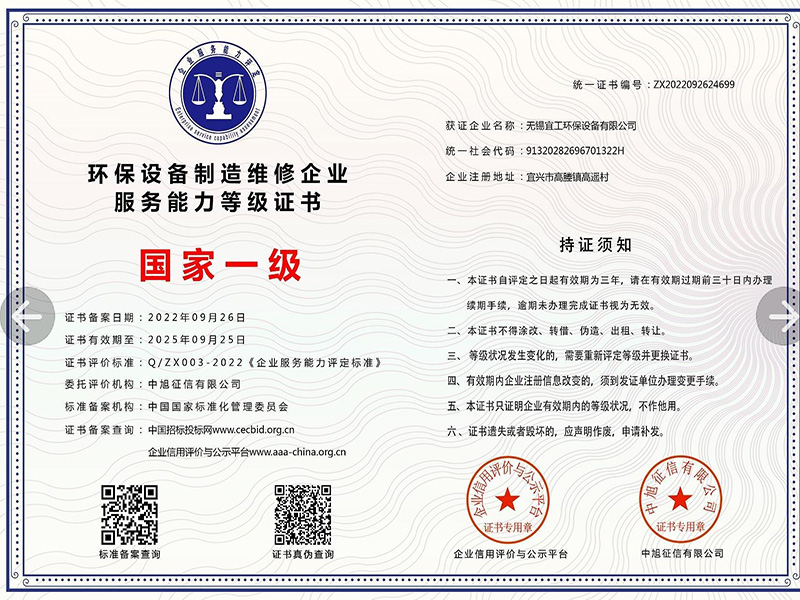 環(huán)保設備制造維修企業(yè)服務能力等級證書